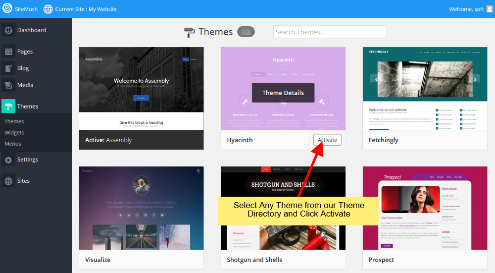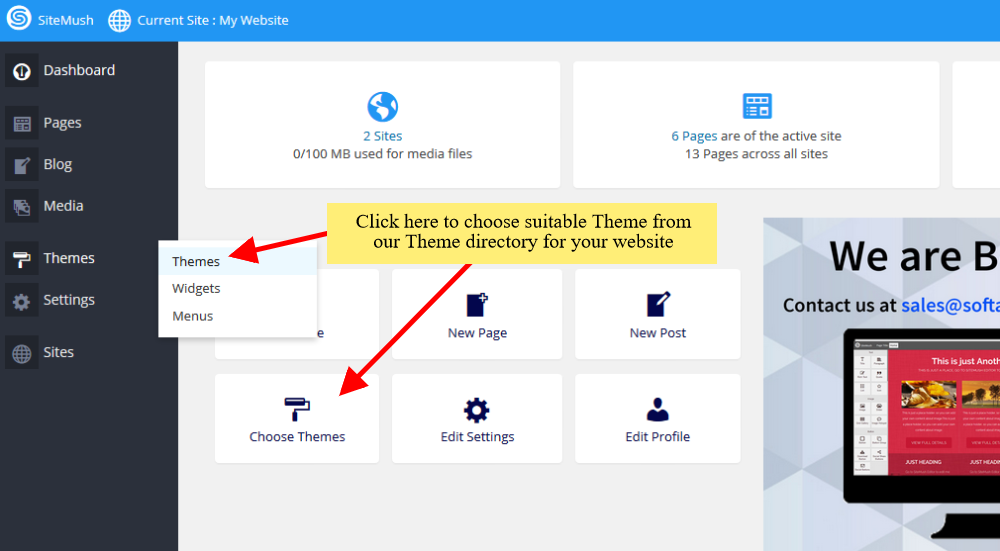 Une fois redirrigé sur SiteMush Website Builder. Vous devrez choisir un thème parmis 208 Thèmes professionels/ Prêts pour Mobiles. Choisissez la catégorie, naviguez et sélectionnez un thème.
