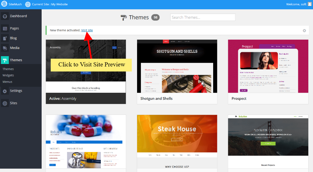 Une fois le thème activé, vous pourrez prévisualiser le site Web en cliquant sur le lien en haut de la page ou revenir et changer de thème si désiré.