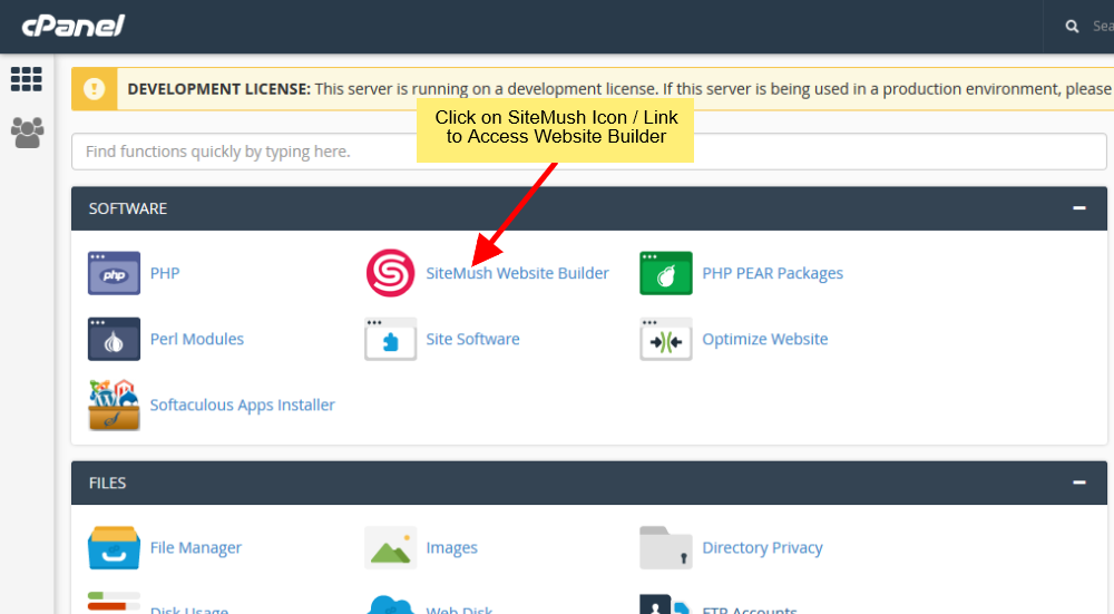 Connectez-vous à votre espace client pour accéder à votre cPanel ou connectez-vous directement à votre panneau de contrôle cPanel (ex: https://votre-domaine.com:2083) et cliquez sur l’icône siteMush pour accéder au créateur de site Web.